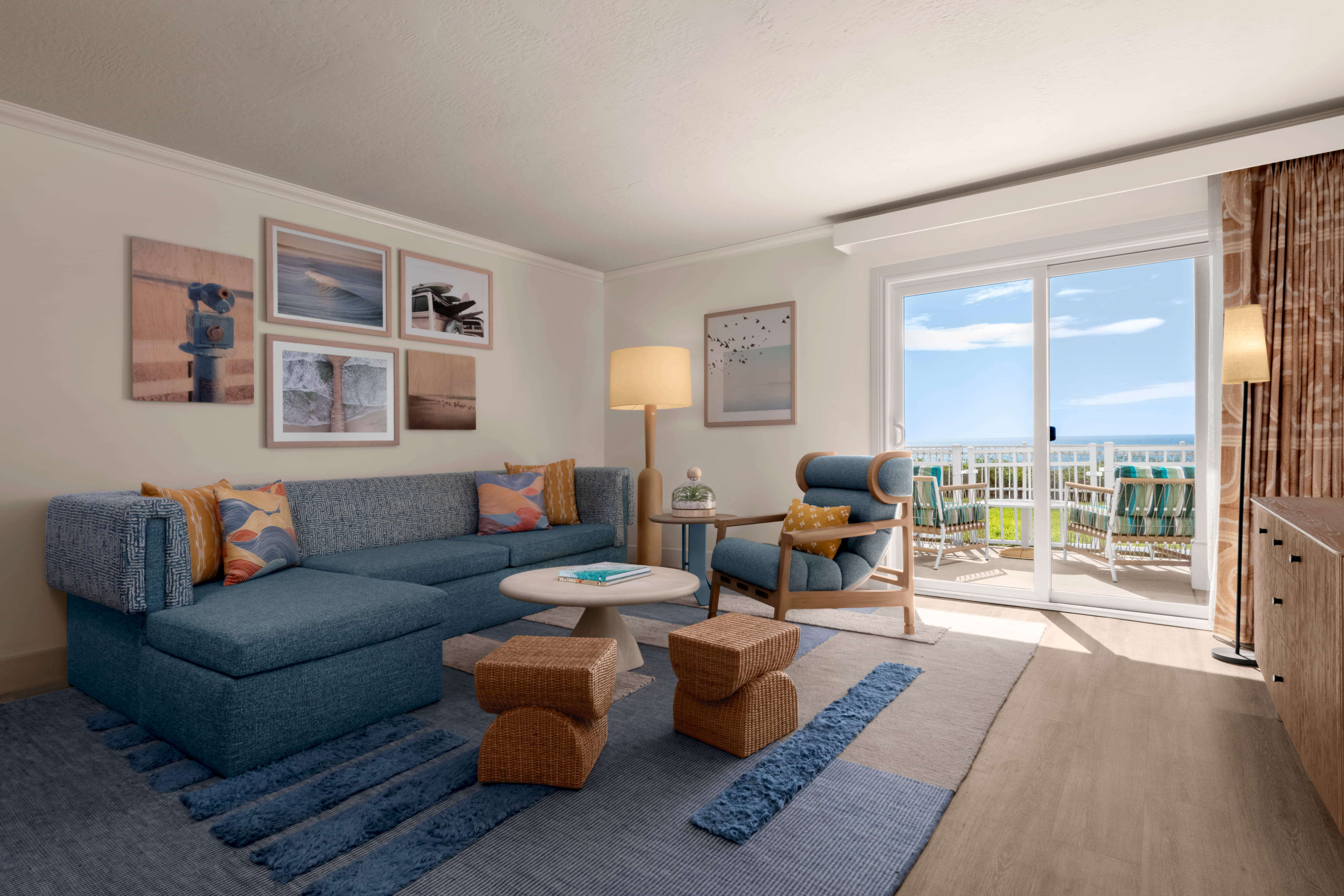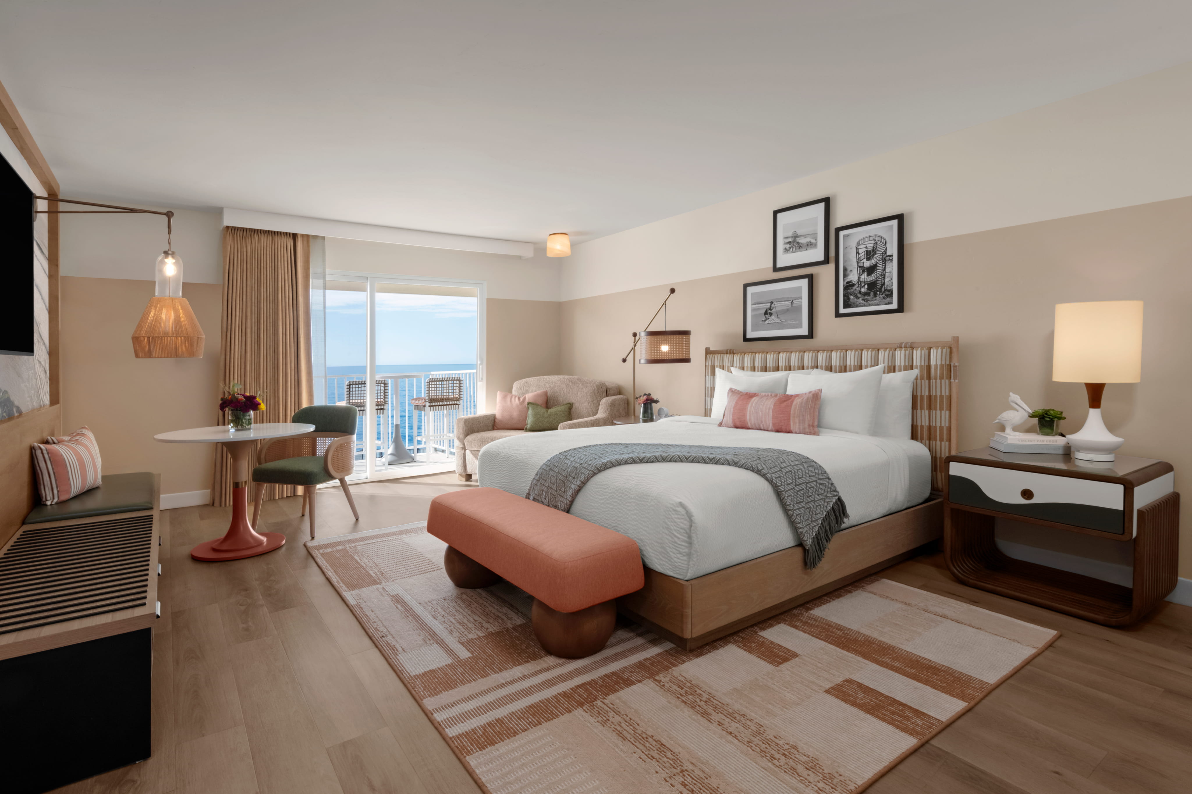 Across the resort, design reflects the dialogue between land and ocean. Shore Cliff rooms draw from the coastal bluffs through earthy palettes, organic forms, and grounded details, while the Lighthouse Suites and Ocean House Suites answer with cool tones and fluid shapes inspired by the movement of the Pacific. Public spaces, including two on-site pools, become the convergence point where these narratives meet, creating places that feel familiar yet expansive, rooted yet quietly transformative.